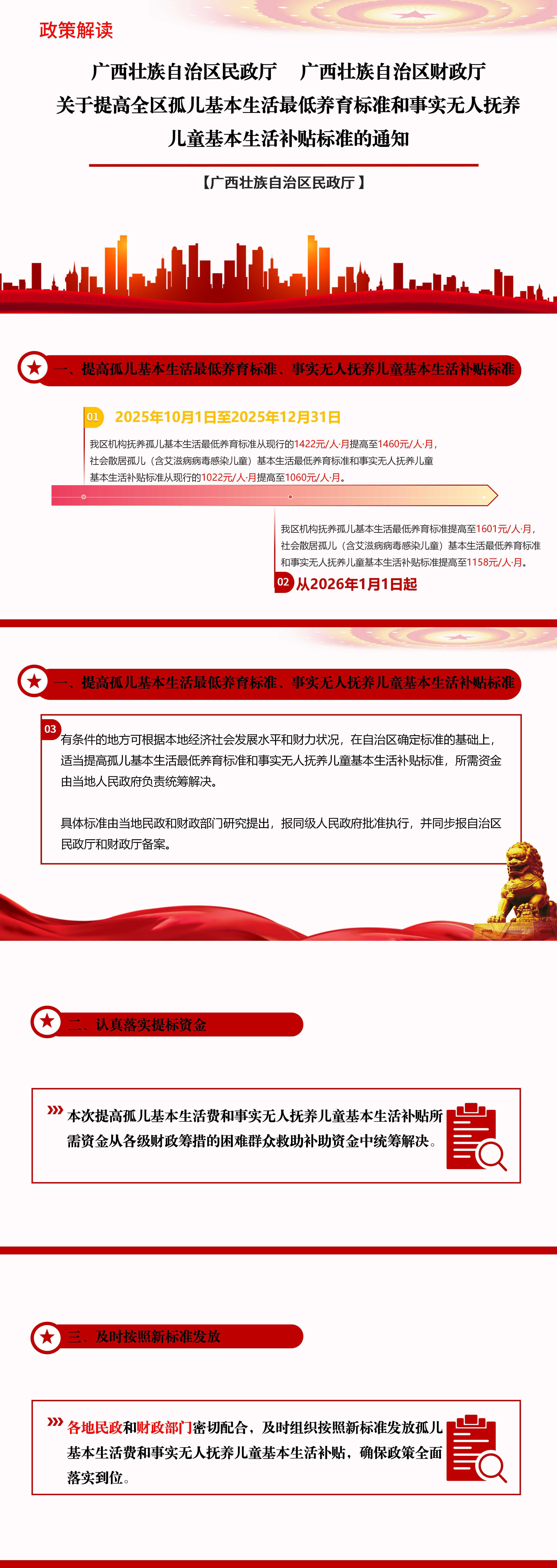 图解:《广西壮族自治区民政厅 广西壮族自治区财政厅关于提高全区孤儿基本生活最低养育标准和事实无人抚养儿童基本生活补贴标准的通知》